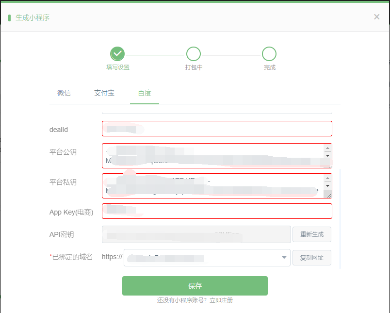 平台私钥为之前用 OpenSSL生成的私钥在生成小程序时填入即可